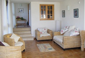 Outside the villa and apartment are approached through a set of double gates with ample parking for cars and visitors’ cars. The villa grounds are large with a hedged lawn at the front, shaded by some large conifers with a bench strategically placed to afford some cool shade in the heat of the day.