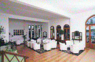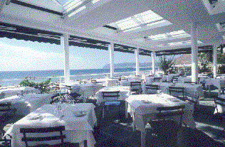 The restaurant is housed in the hotel during the cooler weather, while, during the summer, meals are served on the large terrace overlooking the sea.