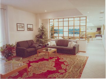 Small in size and furnished in a pleasant and modern style. The wooden reception desk is in front of the entrance, The lobby area is surrounded by windows overlooking the garden, very luminous and it opens to a modern furnished seating area composed by red carpets and dark leather sofas. It also leads to the restaurant/breakfast room.